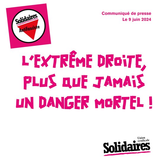 l’extrême droite, plus que jamais un danger mortel !Ce soir, l’extrême droite cumule près de 40% des suffrages. Ces élections européennes rendent manifeste la gravité de la situation. L’extrême droite a toujours été, et demeure plus que jamais l’ennemie mortelle des travailleurs et des travailleuses, des étranger⋅ères, des personnes racisées, des LGBTQI+, et de la démocratie. Le programme de toutes les extrêmes droites, c’est de préserver les privilèges du patronat et des classes sociales favorisées, en désignant des boucs-émissaires à la colère sociale : les étranger⋅es, les femmes, les LGBTQI+... La percée de l’extrême droite est la conséquence de la politique menée par le gouvernement ces deux derniers quinquennats qui a notamment méprisé les luttes menées par les travailleurs et travailleuses comme par exemple lors de la réforme des retraites. Les gouvernements successifs et certains partis ont sans cesse par les propos ou par les actes légitimé les thèses racistes. Les politiques anti-sociales des gouvernements successifs conduisent directement à la progression de l’extrême droite aux élections. L’annonce ce soir de la dissolution de l’Assemblée nationale par le Président de la République rend imminent le péril de l’arrivée au pouvoir de l’extrême droite. Ce faisant, il joue aux apprentis-sorciers et se fait le marchepied de l’extrême droite. L’union syndicale Solidaires condamne cette fuite en avant. Elle appelle solennellement les travailleuses et les travailleurs du pays à s’opposer de toutes leurs forces à l’extrême droite. Pour cela, ses militant⋅es réuniront au plus vite les salarié⋅es sur les lieux de travail. L’Union syndicale Solidaires réunira son comité national dans les prochains jours pour déterminer les mesures qu’elle prendra.L’extrême droite, plus que jamais un danger mortel !