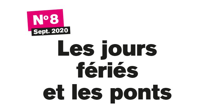 Les jours fériés sont les jours de fêtes légales énumérées par le code du travail : 1er janvier, lundi de Pâques, 1er mai, 8 mai, jeudi de l’Ascension, lundi de Pentecôte, 14 juillet, Assomption (15 août), Toussaint (1er novembre), 11 novembre, jour de Noël (25 décembre). Le 1er mai est le seul jour férié chômé pour tous les salarié·e·s, avec quelques exceptions. Un accord peut définir les autres jours fériés chômés. Sinon, c’est l’employeur qui fixe leur liste. Une journée de pont précédant ou suivant un jour férié peut être prévue dans l’entreprise. Cette pratique ne fait l’objet d’aucune réglementation. La décision est prise par l’employeur et constitue une modification temporaire de l’horaire hebdomadaire. D’autres jours fériés peuvent exister dans certains secteurs d’activité ou certaines régions.