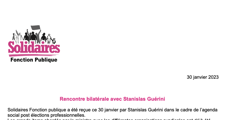 Solidaires Fonction publique a été reçue ce 30 janvier par Stanislas Guérini dans le cadre de l’agenda social post élections professionnelles.