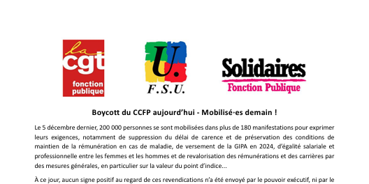 Néanmoins, sur l'ensemble des autres revendications exprimées massivement, le silence assourdissant perdure. En conséquence la CGT, la FSU et Solidaires décident de boycotter le CCFP reconvoqué ce jour.