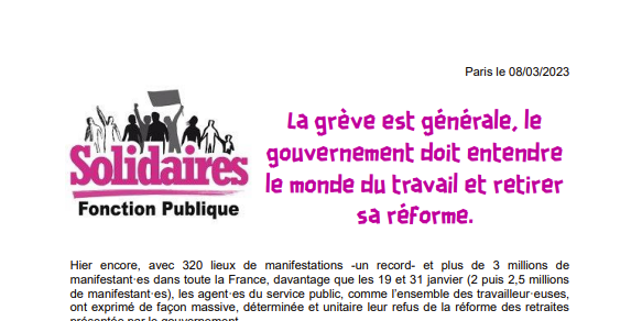 Hier encore, avec 320 lieux de manifestations -un record- et plus de 3 millions de manifestant·es dans toute la France, davantage que les 19 et 31 janvier (2 puis 2,5 millions de manifestant·es), les agent·es du service public, comme l’ensemble des travailleur·euses, ont exprimé de façon massive, déterminée et unitaire leur refus de la réforme des retraites présentée par le gouvernement.