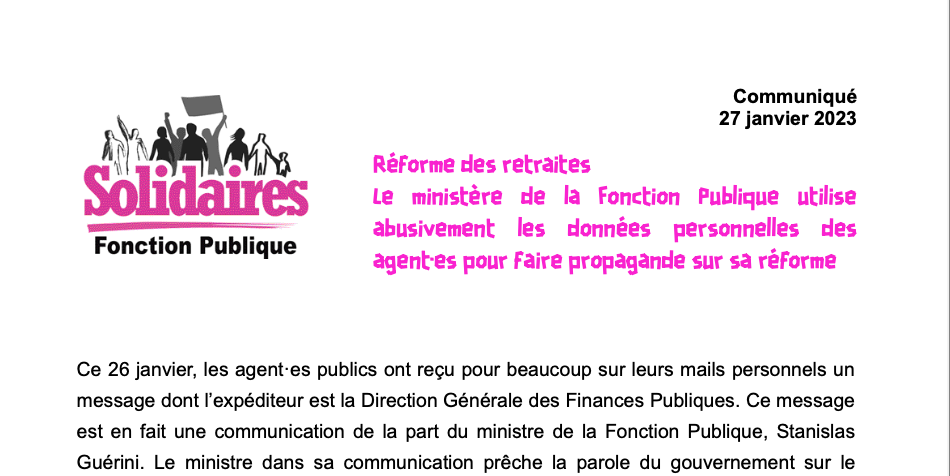Réforme des retraites Le ministère de la Fonction Publique utilise abusivement les données personnelles des agent·es pour faire propagande sur sa réforme