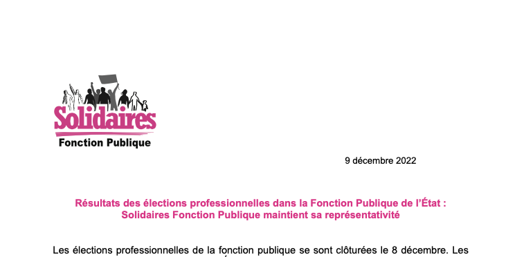 Résultats des élections professionnelles dans la Fonction Publique de l’État : Solidaires Fonction Publique maintient sa représentativité