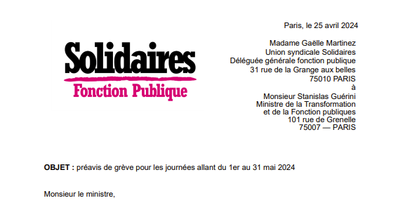 L’Union syndicale Solidaires Fonction publique dépose un préavis de grève pour les journées allant du 1er au 31 mai 2024 (de 0 h à 24 h).