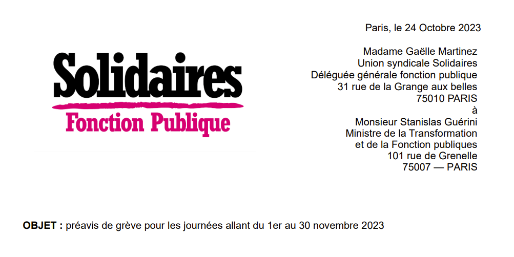 L’Union syndicale Solidaires Fonction publique dépose un préavis de grève pour les journées allant du 1er au 30 novembre 2023 (de 0 h à 24 h).