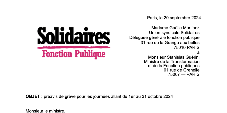 L’Union syndicale Solidaires Fonction publique dépose un préavis de grève pour les journées allant du 1er au 31 octobre 2024 (de 0 h à 24 h).