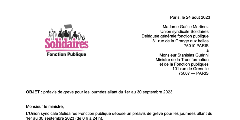 L’Union syndicale Solidaires Fonction publique dépose un préavis de grève pour les journées allant du 1er au 30 septembre 2023 (de 0 h à 24 h).
