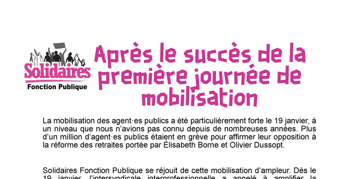 Solidaires Fonction Publique se réjouit de cette mobilisation d’ampleur. Dès le 19 janvier, l’intersyndicale interprofessionnelle a appelé à amplifier la mobilisation en faisant du 31 janvier le début du 2e round contre le projet de réforme des retraites. Pour Solidaires Fonction Publique, il est important dans les jours à venir de préparer la réussite de cette nouvelle journée : nous appelons les agent·es publics à se réunir en Heures d’information syndicales, en Assemblées Générales et à préparer collectivement les suites du 31 janvier, y compris en mettant en débat la reconduction de la grève.