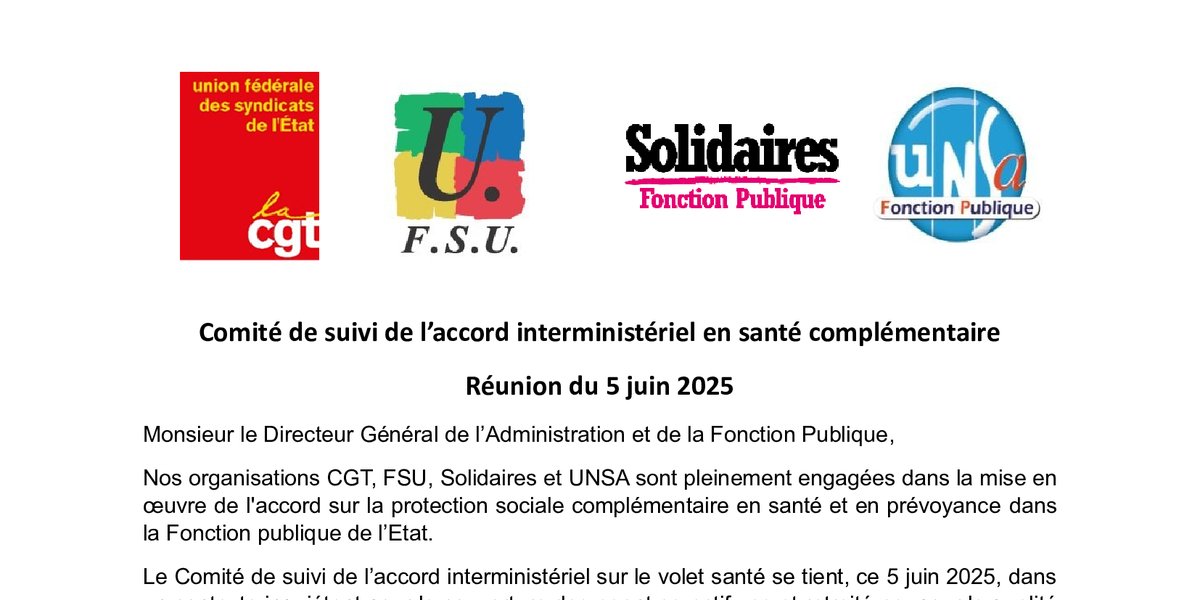 Nos organisations CGT, FSU, Solidaires et UNSA sont pleinement engagées dans la mise en œuvre de l'accord sur la protection sociale complémentaire en santé et en prévoyance dans la Fonction publique de l’Etat. Le Comité de suivi de l’accord interministériel sur le volet santé se tient, ce 5 juin 2025, dans un contexte inquiétant pour la couverture des agent.es actif·ves et retraité·es, pour la qualité de service attendue par les services RH et pour le dialogue social. En tant que 1er signataire, le ministre de la Fonction Publique a la responsabilité de s’assurer que les choix d’opérateurs par les ministères ne vont pas à l’encontre du progrès attendu et de la réponse aux besoins des agent⋅es. Après les décisions prises au ministère de l’Environnement et de la Transition Ecologique, à l’Assemblée Nationale et aux Services du Premier ministre, l’annonce du choix d’ALAN aux ministères économiques et financiers est, une nouvelle fois, incompréhensible. Le choix d’ALAN nous questionne et nous inquiète quant au prestataire retenu.