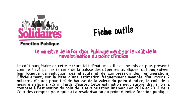 Le coût budgétaire de cette mesure fait débat, mais il est une fois de plus présenté comme élevé par les tenants de la baisse des dépenses publiques, qui poursuivent leur logique de réduction des effectifs et de compression des rémunérations. Officiellement, sur la base d’une estimation fréquemment avancée d’au moins 2 milliards d’euros pour 1 % de hausse de la valeur du point d’indice, le coût de la mesure s'élève à 7,5 milliards d'euros. Cette estimation peut surprendre, si on la compare à l’estimation du coût de la revalorisation intervenu en 2016 et 2017 de la Cour des comptes pour qui : « La revalorisation du point d’indice fonction publique, pour la première fois depuis 2010, de 0,6 point au 1er juillet 2016 et 0,6 point au 1er février 2017 a un coût en 2017 estimé à 648 millions d’euros ». Autrement dit, le coût brut de la hausse de la valeur du point d’indice reste à évaluer précisément même si nous retiendrons ici le cout brut de 7,5 milliards d’euros. Cette présentation est trompeuse et spécieuse, voici pourquoi.