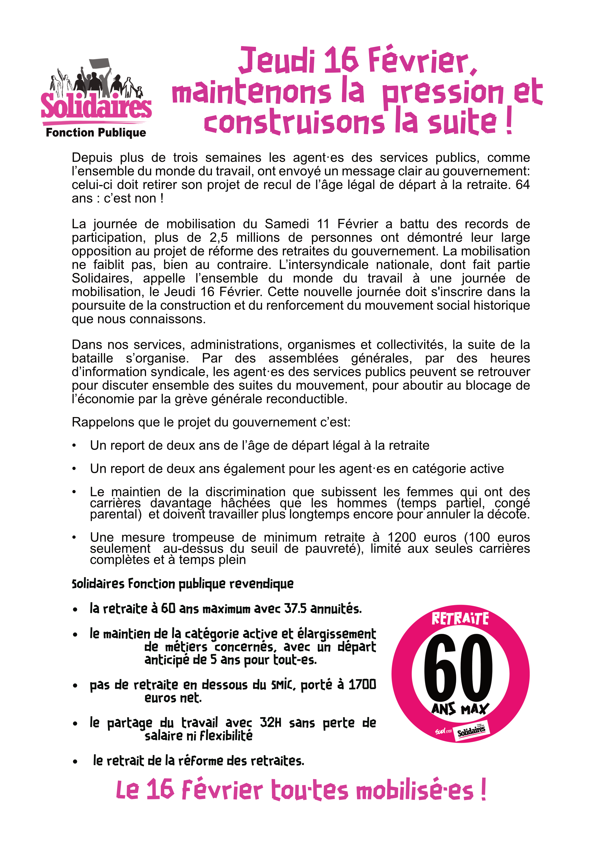 La journée de mobilisation du Samedi 11 Février a battu des records de participation, plus de 2,5 millions de personnes ont démontré leur large opposition au projet de réforme des retraites du gouvernement. La mobilisation ne faiblit pas, bien au contraire. L’intersyndicale nationale, dont fait partie Solidaires, appelle l’ensemble du monde du travail à une journée de mobilisation, le Jeudi 16 Février. Cette nouvelle journée doit s'inscrire dans la poursuite de la construction et du renforcement du mouvement social historique que nous connaissons.