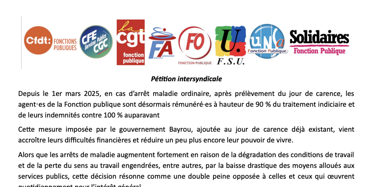Chaque agent·e est invité·e à signer cette pétition en faveur de l’abrogation du jour de carence et du maintien de la rémunération à 100 % en cas de congé de maladie ordinaire.
