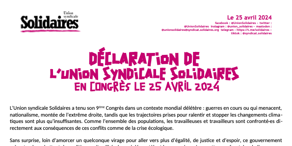 Déclaration de l’Union syndicale Solidaires en congrès le 25 avril 2024