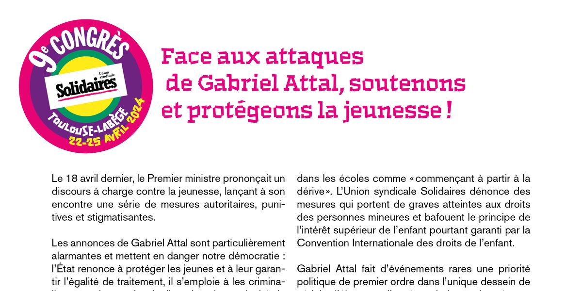 L’union syndicale Solidaires dénonce la mise au pas que Gabriel Attal veut imposer à la jeunesse. Elle s’engage à défendre les droits des personnes mineures en combattant toutes les mesures qui leur portent atteinte.