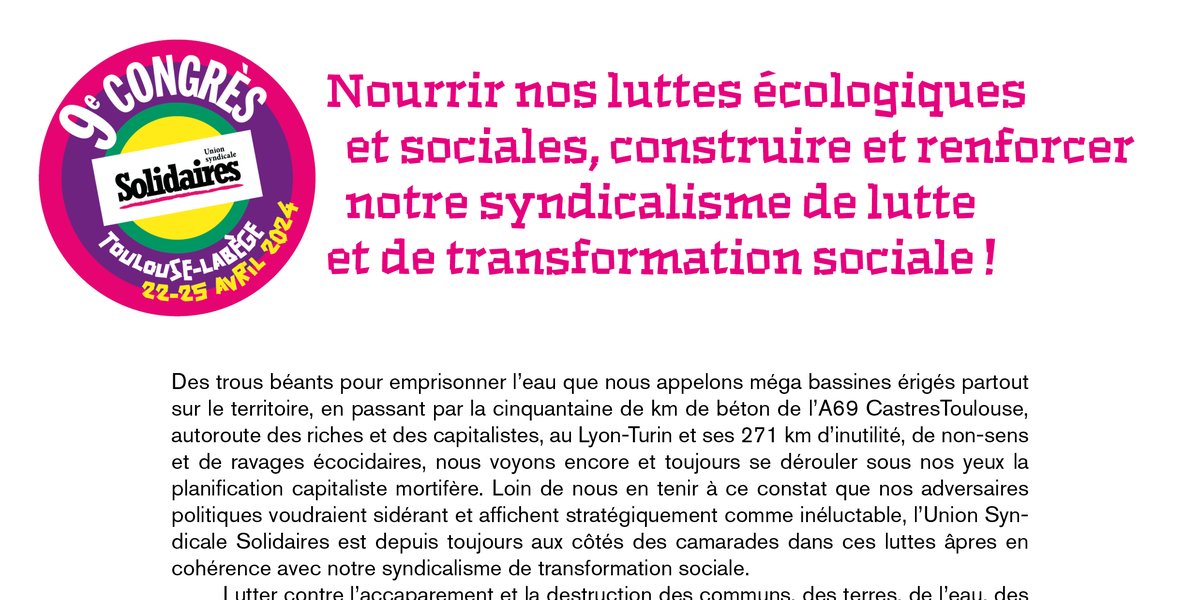 L’Union Syndicale Solidaires réunie en Congrès prend la mesure de l’ampleur de la destruction du vivant et appelle l’ensemble des ses composantes à s’engager dans le combat qui nous permet d’envisager un avenir possible. Elle restera ainsi qu’elle l’a toujours été, en soutien comme à l’initiative de ces luttes, que ce soit sur un plan humain, matériel voire financier à la mesure de ses moyens afin de garantir un cadre de vie décent, condition essentielle de nos existences, pour l’ensemble des travailleuses des travailleurs, des habitants et des habitantes humaines et non humaines dans ce monde que nous souhaitons continuer d’habiter de la meilleure manière possible.