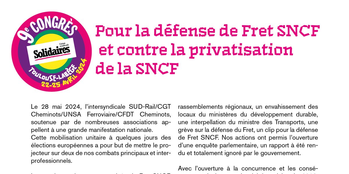 Réuni pour son 9e congrès, l’Union syndicale Solidaires s’engage, aux côtés de sa fédération SUD-Rail, à faire du 28 mai, une grande journée de défense de notre outil public et écologique de service de transports ferroviaire. La fédération SUD-Rail avec nos allié-e-s de l’Alliance Ecologique et Sociale organisera un cortège dynamique où vous avez toutes et tous votre place !