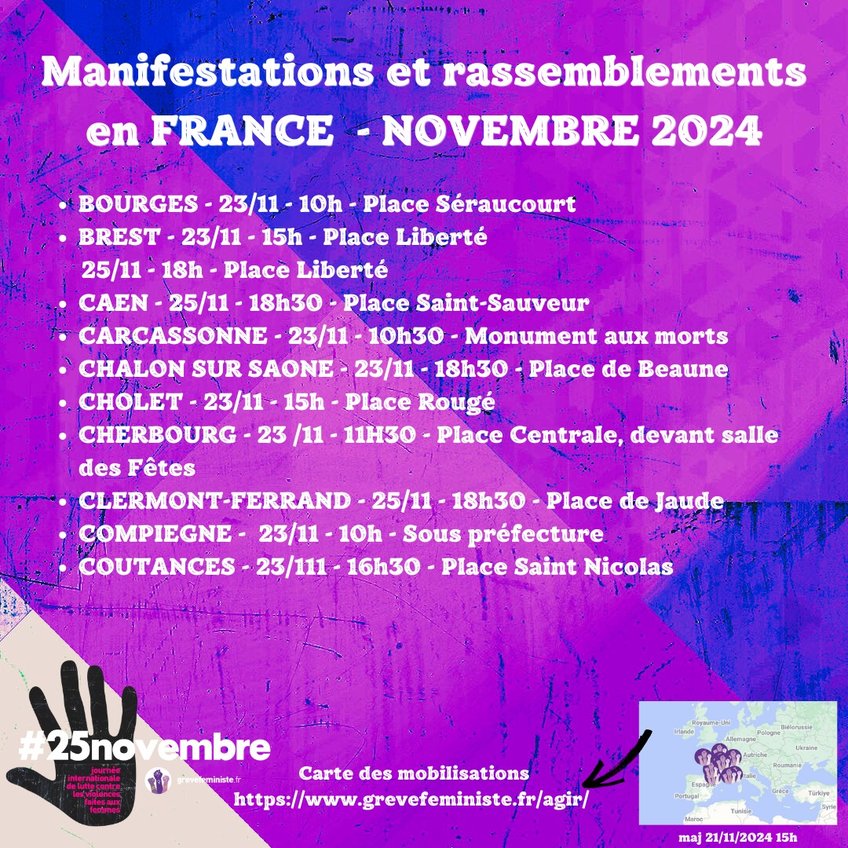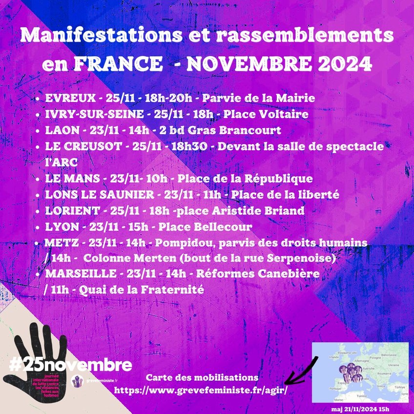 Les 23, 24 ou 25 novembre, dans les rues, partout en France et dans le monde, nous manifesterons pour dire Stop aux violences faites aux femmes ! Parce que tant qu'une seule d'entre nous subira des violences, qu'elles soient physiques, psychologiques, ou sexuelles, nous lutterons. De l'Iran au Mexique aux Etats-Unis, de l’Afghanistan à la Russie à la France, des femmes du monde entier luttent pour leur droit, pour une vie sans peur et sans violence.