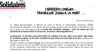 Solidaires revendique la retraite à 60 ans (37,5 ans de cotisations) et un départ anticipé de 5 ans sur cet âge légal pour les carrières longues et les métiers pénibles.