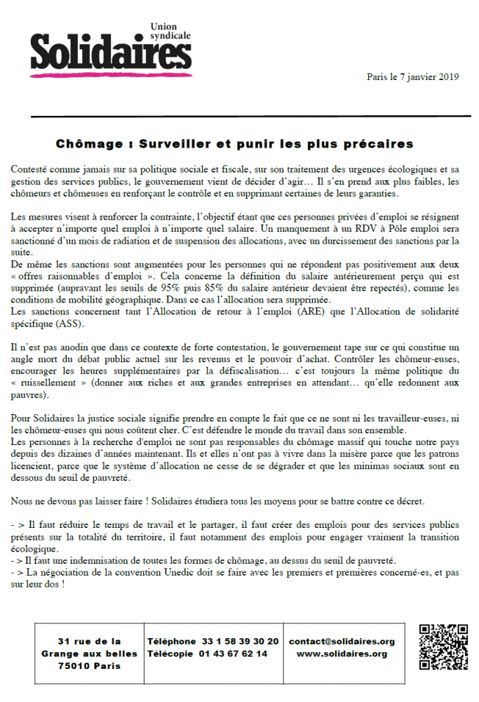 Les personnes à la recherche d'emploi ne sont pas responsables du chômage massif qui touche notre pays depuis des dizaines d’années maintenant. Ils et elles n’ont pas à vivre dans la misère parce que les patrons licencient, parce que le système d’allocation ne cesse de se dégrader et que les minimas sociaux sont en dessous du seuil de pauvreté.