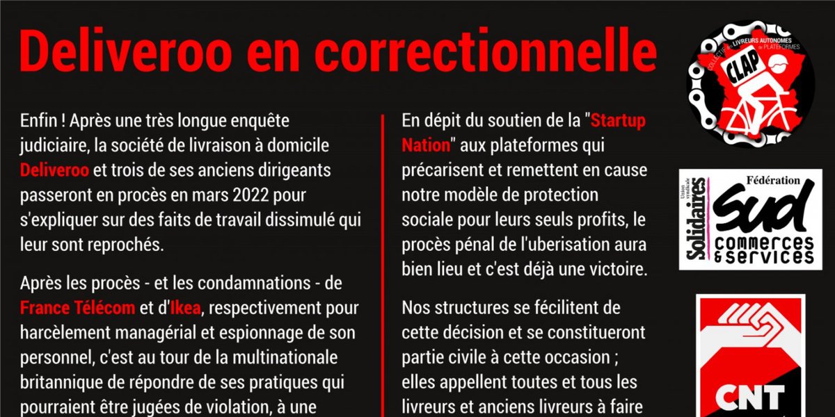 communiqué commun suite au procés à venir de Deliveroo pour travail dissimulé