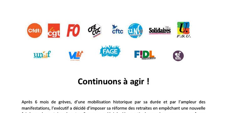 Pour tous les travailleur.euses, les étudiant.es et les lycéen.nes que nous représentons, qui nous ont fait confiance, pour toutes celles et ceux qui ont manifesté, parfois pour la première fois et pour toutes celles et ceux qui ont rejoint les rangs syndicaux pour participer à ce combat, nous adressons un message collectif: nous continuerons à contester cette réforme des retraites et à nous battre pour la justice sociale.