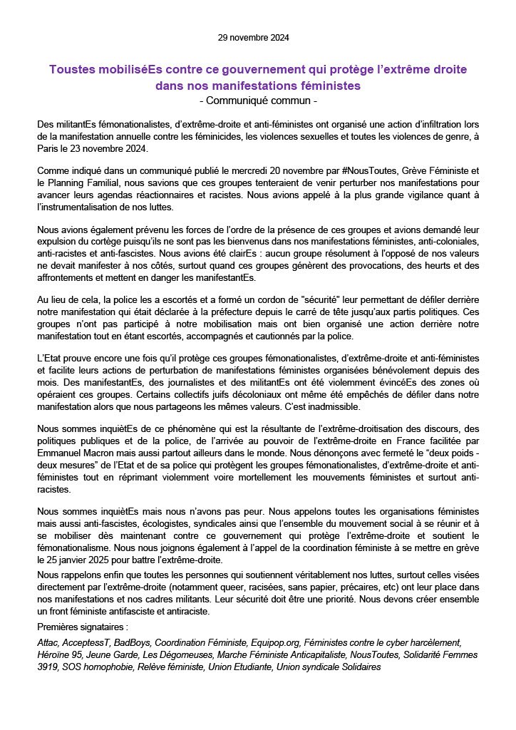 Nous sommes inquiètEs mais nous n’avons pas peur. Nous appelons toutes les organisations féministes mais aussi anti-fascistes, écologistes, syndicales ainsi que l’ensemble du mouvement social à se réunir et à se mobiliser dès maintenant contre ce gouvernement qui protège l’extrême-droite et soutient le fémonationalisme. Nous nous joignons également à l’appel de la coordination féministe à se mettre en grève le 25 janvier 2025 pour battre l’extrême-droite.
