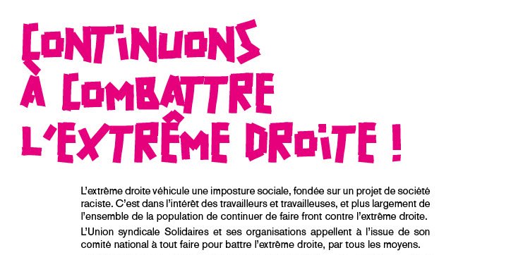 L’extrême droite véhicule une imposture sociale, fondée sur un projet de société raciste. C’est dans l’intérêt des travailleurs et travailleuses, et plus largement de l’ensemble de la population de continuer de faire front contre l’extrême droite.