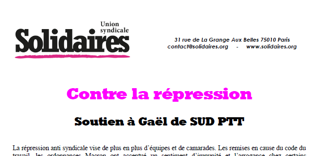 Contre la répression : Soutien à Gaël de SUD PTT