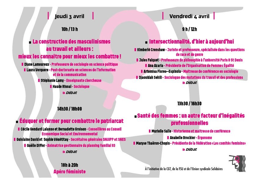 La première journée articulera deux thèmes pour mieux combattre le patriarcat : nous démarrerons par une table ronde sur la construction des masculinismes au travail et ailleurs, comment mieux les connaître pour mieux les combattre. Nous continuerons l’après-midi avec un débat autour de l’éducation et de la formation - en particulier autour des programmes EVARS (éducation à la vie affective relationnelle et sexuelle) qui constituent une victoire syndicale et féministe récente. Nous terminerons cette première journée par avec le traditionnel « Apéro féministe » afin de poursuivre nos discussions autour d’un verre.