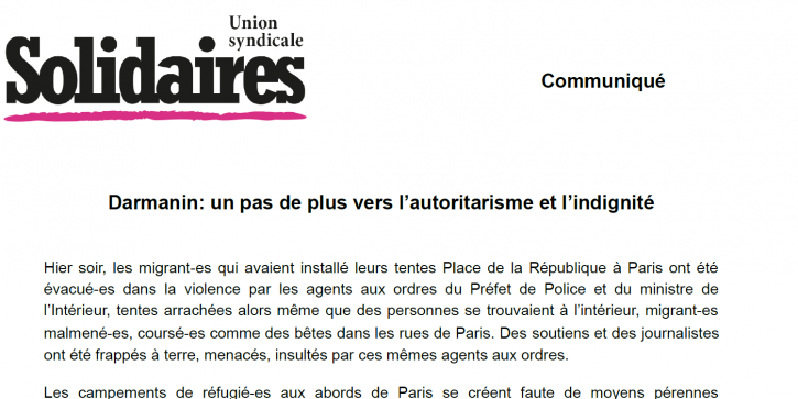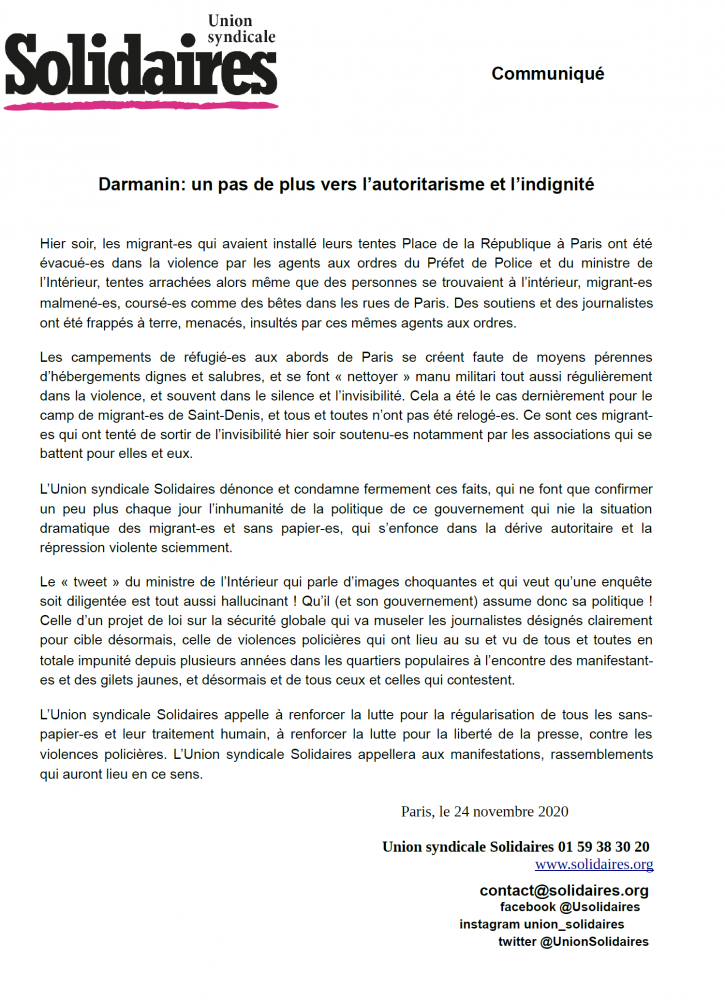 L’Union syndicale Solidaires appelle à renforcer la lutte pour la régularisation de tous les sans-papier-es et leur traitement humain, à renforcer la lutte pour la liberté de la presse, contre les violences policières. L’Union syndicale Solidaires appellera aux manifestations, rassemblements qui auront lieu en ce sens.