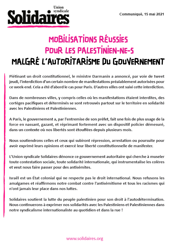 Solidaires soutient la lutte du peuple palestinien pour son droit à l'autodétermination. Nous continuerons à exprimer nos solidarités avec les Palestiniens et Palestiniennes dans notre syndicalisme internationaliste au quotidien et dans la rue !