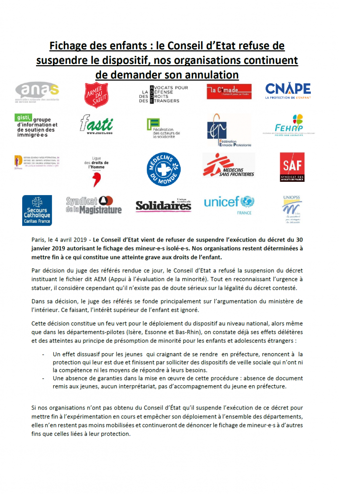 L'Union syndicale Solidaires a rejoint le groupe inter-associatif et syndical visant au retrait du fichage des mineur-es isolé-es (fichier AEM). Si un recours en référé en demande de suspension devant la Conseil d'Etat n'a pas abouti, l'action se poursuivra par un recours au fond ainsi qu'une campagne en direction des Conseils départementaux.