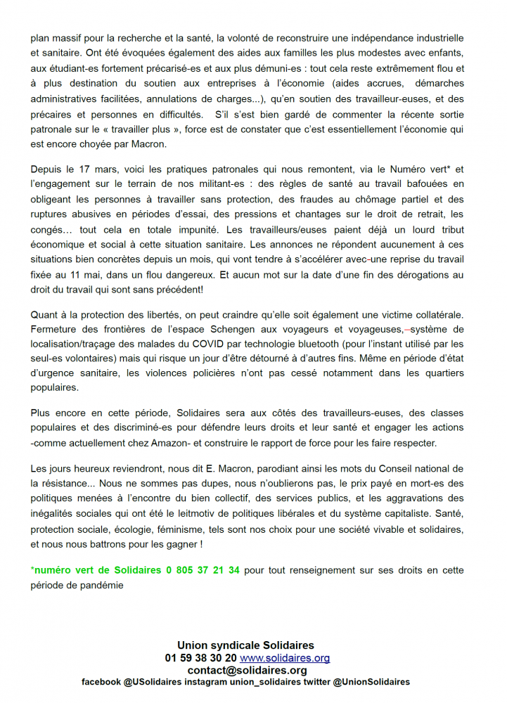 *numéro vert de Solidaires 0 805 37 21 34 pour tout renseignement sur ses droits en cette période de pandémie