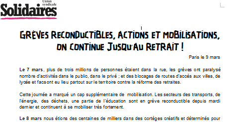 Le 7 mars, plus de trois millions de personnes étaient dans la rue, les grèves ont paralysé nombre d’activités dans le public, dans le privé ; et des blocages de routes d’accès aux villes, de lycée et facs ont eu lieu partout sur le territoire contre la réforme des retraites.