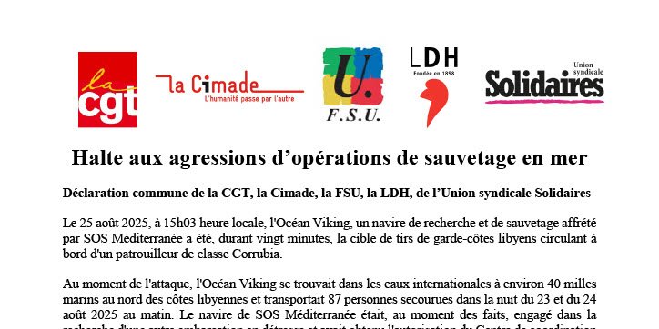 La CGT, la Cimade, la FSU, la LDH et l’Union syndicale Solidaires attendent des autorités européennes qu'une enquête soit diligentée sur cette attaque et que de réelles dispositions soient prises pour faciliter et sécuriser les opérations de sauvetage solidaires. L’Union européenne doit mettre un terme à l’accord passé avec la Libye et, de façon générale, promouvoir le respect des droits humains pour sa politique migratoire et notamment dans ses relations avec des Etats tiers.