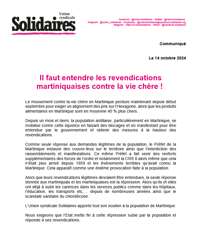 L’Union syndicale Solidaires apporte tout son soutien à la population de Martinique.