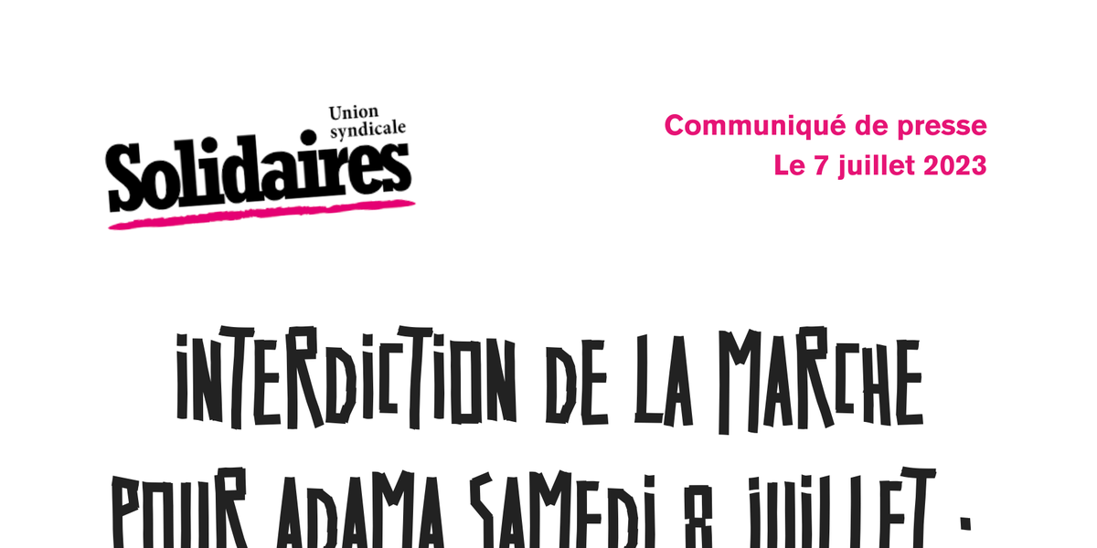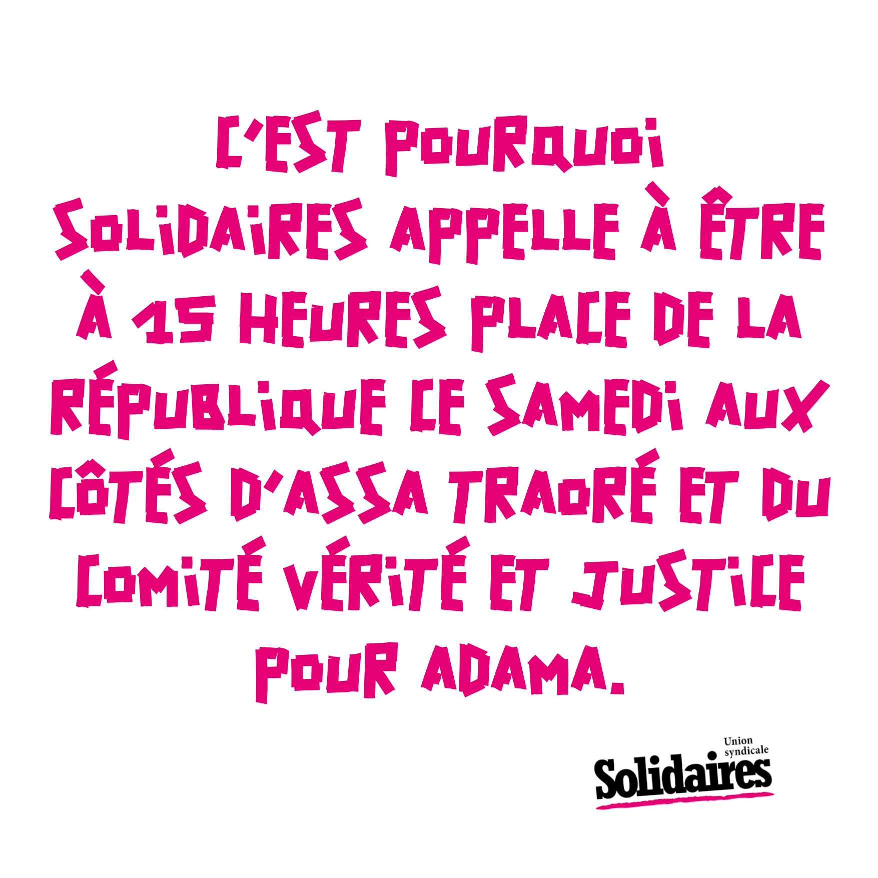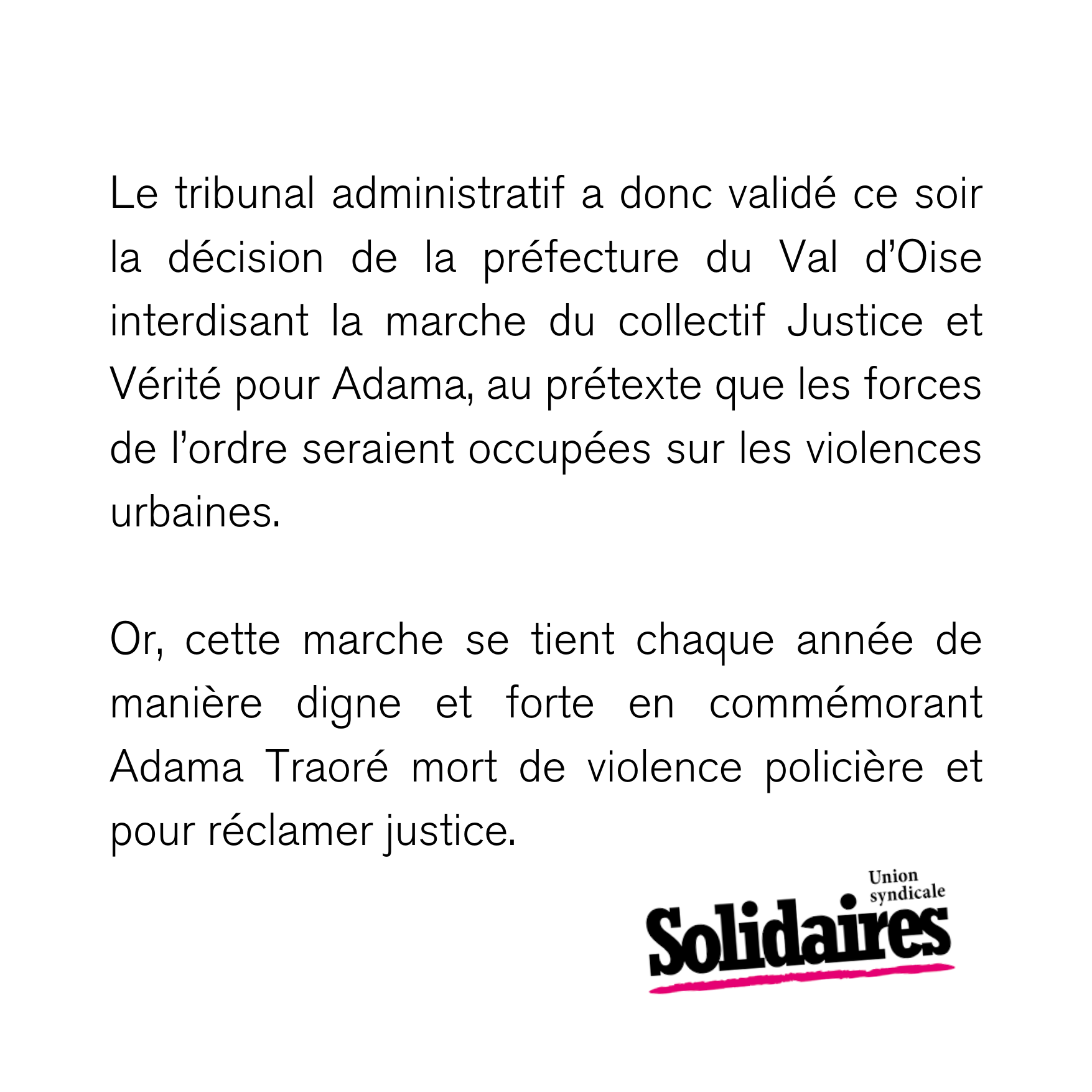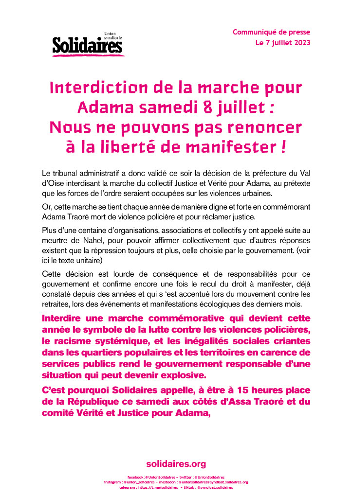 C’est pourquoi Solidaires appelle, à être à 15 heures place de la République ce samedi aux côtés d’Assa Traoré et du comité Vérité et Justice pour Adama,