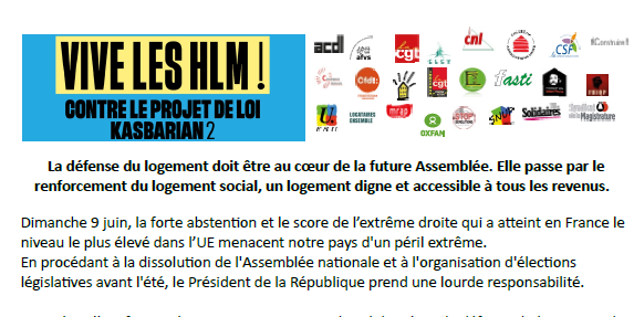 Nous, le collectif « Vive les HLM », associations de solidarité ou de défense du logement, de locataires, de sans-logis et de syndicats de salarié·es confronté·es aux difficultés croissantes pour se loger, mobilise ses forces pour un sursaut démocratique et social, et refuse le scénario de la victoire de l'extrême droite.