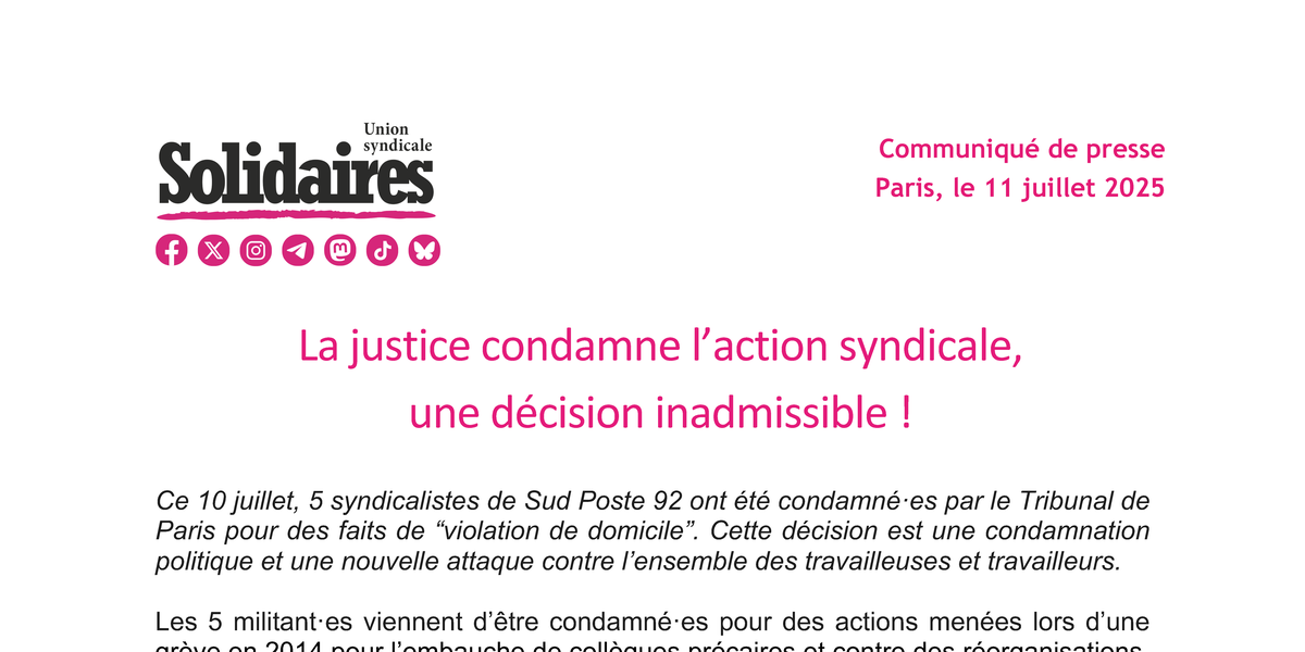 Ce 10 juillet, 5 syndicalistes de Sud Poste 92 ont été condamné·es par le Tribunal de Paris pour des faits de “violation de domicile”. Cette décision est une condamnation politique et une nouvelle attaque contre l’ensemble des travailleuses et travailleurs.