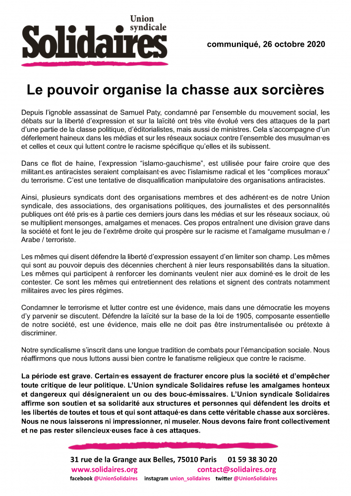 Ainsi, plusieurs syndicats dont des organisations membres et des adhérent∙es de notre Union syndicale, des associations, des organisations politiques, des journalistes et des personnalités publiques ont été pris∙es à partie ces derniers jours dans les médias et sur les réseaux sociaux, où se multiplient mensonges, amalgames et menaces. Ces propos entraînent une division grave dans la société et font le jeu de l’extrême droite qui prospère sur le racisme et l’amalgame musulman∙e / arabe / terroriste.