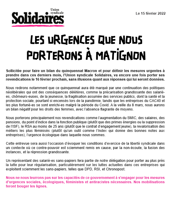 Sollicitée pour faire un bilan du quinquennat Macron et pour définir les mesures urgentes à prendre dans ces derniers mois, l’Union syndicale Solidaires, va encore une fois porter ses revendications le 16 février prochain, sans illusions quant aux réponses qui lui seront données.