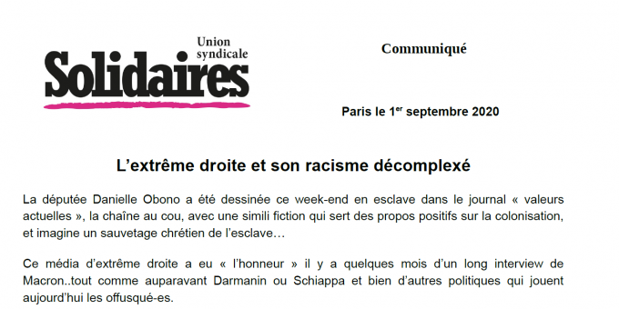 L’Union syndicale Solidaires soutient pleinement Danielle Obono, Anasse Kazib, et toutes celles et ceux victimes du racisme au quotidien.
