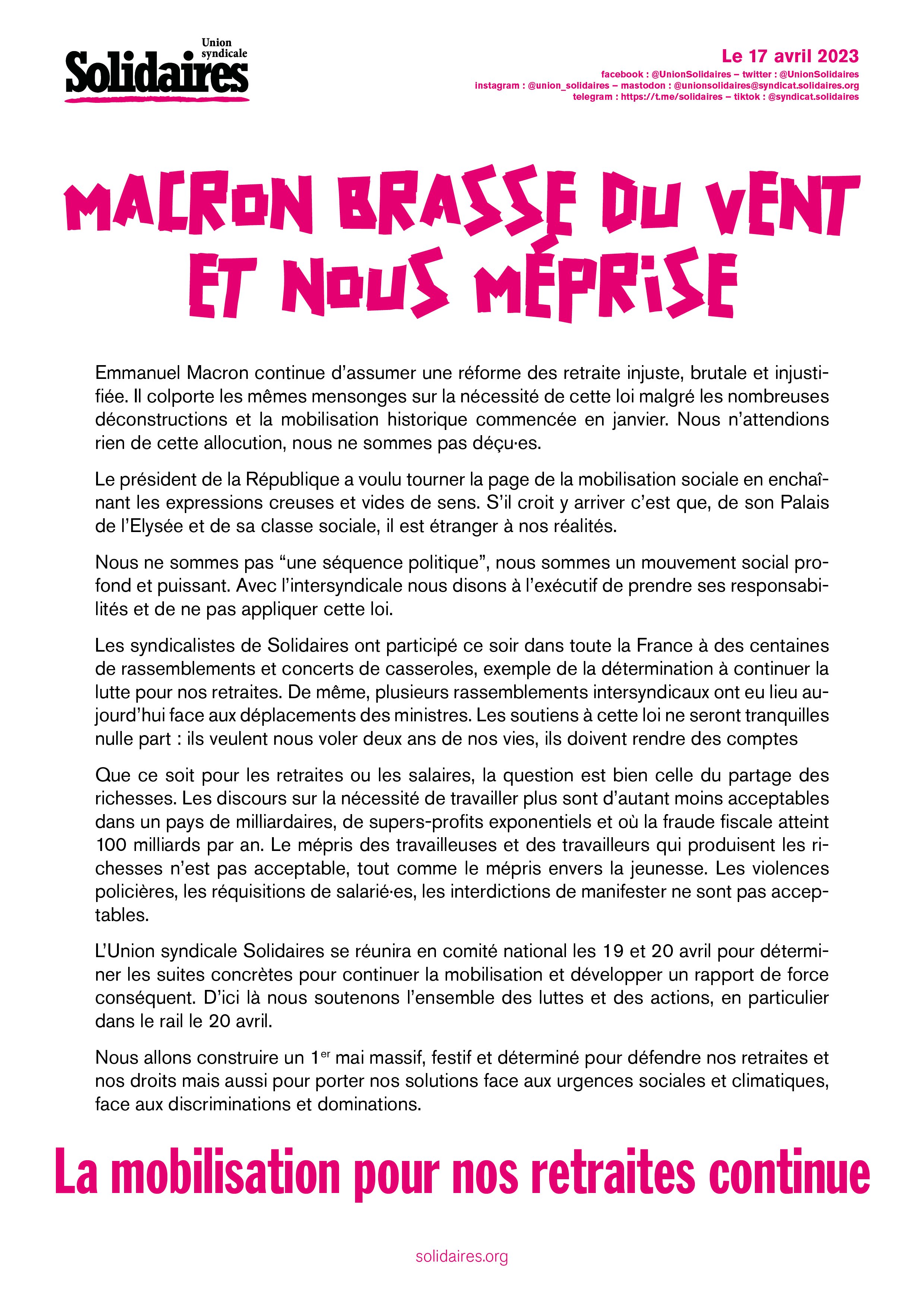 Emmanuel Macron continue d’assumer une réforme des retraite injuste, brutale et injustifiée. Il colporte les mêmes mensonges sur la nécessité de cette loi malgré les nombreuses déconstructions et la mobilisation historique commencée en janvier. Nous n’attendions rien de cette allocution, nous ne sommes pas déçu·es.
