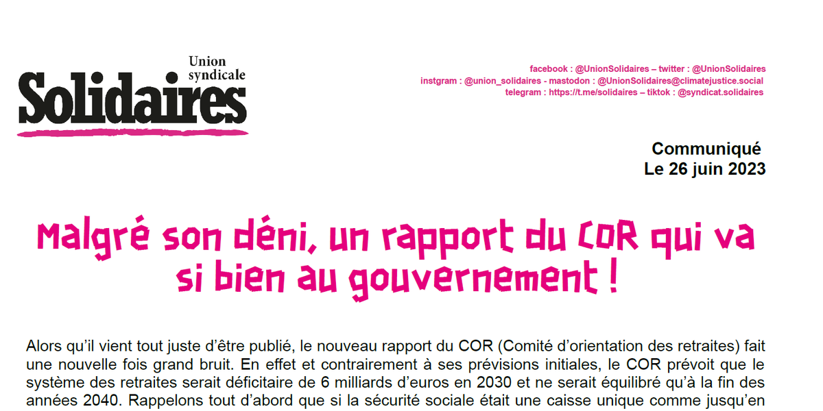 Alors qu’il vient tout juste d’être publié, le nouveau rapport du COR (Comité d’orientation des retraites) fait une nouvelle fois grand bruit. En effet et contrairement à ses prévisions initiales, le COR prévoit que le système des retraites serait déficitaire de 6 milliards d’euros en 2030 et ne serait équilibré qu’à la fin des années 2040. Rappelons tout d’abord que si la sécurité sociale était une caisse unique comme jusqu’en 1967, ce « déficit » n’existerait pas et que si l’égalité salariale entre femmes et hommes était une réalité, il existerait encore moins. Sans parler des exonérations de cotisations patronales (75 Mds€) et la fraude sociale patronale notamment sur le sujet du travail dissimulé (8,5 Mds€) qui pèsent à eux deux près de 85 milliards d’euros de cotisations et qui manquent cruellement à la sécurité sociale. C’est qu’il ne faudrait surtout pas déplaire au patronat : ne sont ainsi pas plus évoqués les salaires en berne dont l’augmentation permettrait pourtant des rentrées supplémentaires. Il est vrai qu’assécher les recettes de la sécurité sociale provoque des déficits artificiels permettant de justifier son démantèlement !