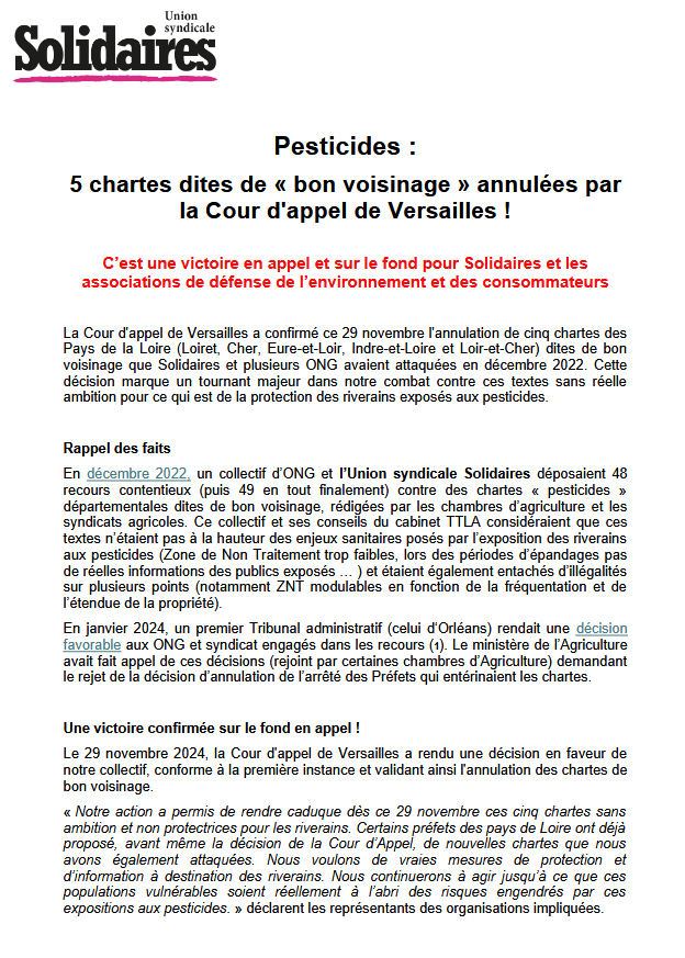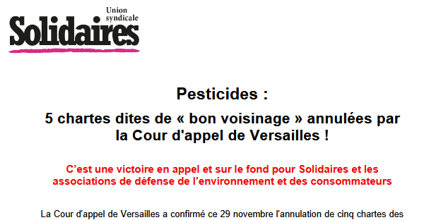 La Cour d'appel de Versailles a confirmé ce 29 novembre l'annulation de cinq chartes des Pays de la Loire (Loiret, Cher, Eure-et-Loir, Indre-et-Loire et Loir-et-Cher) dites de bon voisinage que Solidaires et plusieurs ONG avaient attaquées en décembre 2022. Cette décision marque un tournant majeur dans notre combat contre ces textes sans réelle ambition pour ce qui est de la protection des riverains exposés aux pesticides.