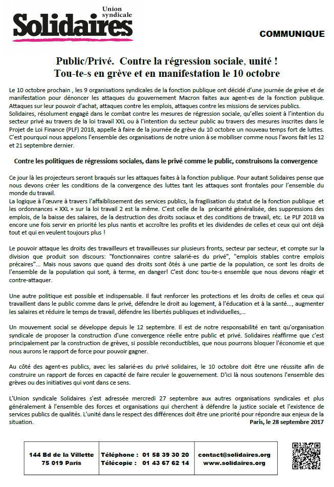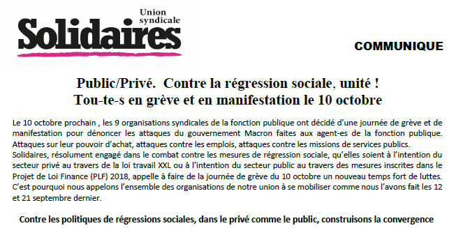 Public/Privé. Contre la régression sociale, unité ! Tou-te-s en grève et en manifestation le 10 octobre
