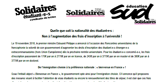 dénonçant cette annonce scandaleuse et discriminatoire qui touchera de plein fouet les étudiant-e-s à l’exemple de l’Université de Lille qui a déjà prise position contre la hausse à son Conseil d’Administration du 22 novembre. Nous pousserons ainsi la présidence de l’université, si prompte à nous rappeler la nécessité « d’internationaliser nos formations », à prendre position sur cette question.à signer la pétition nationale