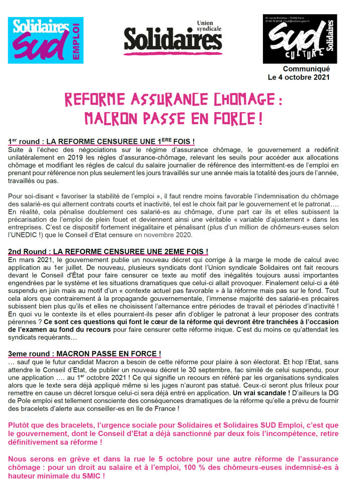 Nous serons en grève et dans la rue le 5 octobre pour une autre réforme de l’assurance chômage : pour un droit au salaire et à l’emploi, 100 % des chômeurs-euses indemnisé-es à hauteur minimale du SMIC !