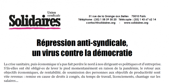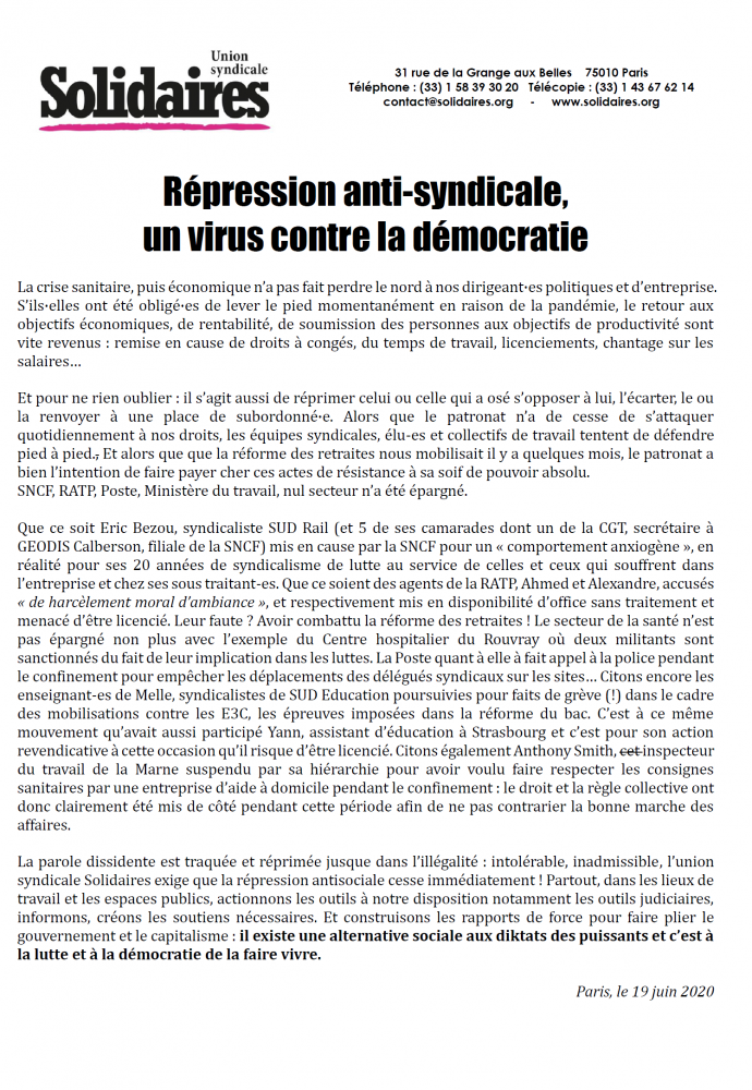 Que ce soit Eric Bezou, syndicaliste SUD Rail (et 5 de ses camarades dont un de la CGT, secrétaire à GEODIS Calberson, filiale de la SNCF) mis en cause par la SNCF pour un « comportement anxiogène », en réalité pour ses 20 années de syndicalisme de lutte au service de celles et ceux qui souffrent dans l’entreprise et chez ses sous traitant-es. Que ce soient des agents de la RATP, Ahmed et Alexandre, accusés « de harcèlement moral d’ambiance », et respectivement mis en disponibilité d’office sans traitement et menacé d’être licencié. Leur faute ? Avoir combattu la réforme des retraites ! Le secteur de la santé n’est pas épargné non plus avec l’exemple du Centre hospitalier du Rouvray où deux militants sont sanctionnés du fait de leur implication dans les luttes. La Poste quant à elle à fait appel à la police pendant le confinement pour empêcher les déplacements des délégués syndicaux sur les sites… Citons encore les enseignant-es de Melle, syndicalistes de SUD Education poursuivies pour faits de grève (!) dans le cadre des mobilisations contre les E3C, les épreuves imposées dans la réforme du bac. C’est à ce même mouvement qu’avait aussi participé Yann, assistant d’éducation à Strasbourg et c’est pour son action revendicative à cette occasion qu’il risque d’être licencié. Citons également Anthony Smith, cet inspecteur du travail de la Marne suspendu par sa hiérarchie pour avoir voulu faire respecter les consignes sanitaires par une entreprise d’aide à domicile pendant le confinement : le droit et la règle collective ont donc clairement été mis de côté pendant cette période afin de ne pas contrarier la bonne marche des affaires.