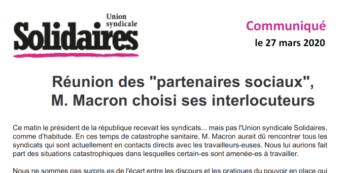 Ce matin le président de la république recevait les syndicats... mais pas l'Union syndicale Solidaires, comme d’habitude. En ces temps de catastrophe sanitaire, M. Macron aurait dû rencontrer tous les syndicats qui sont actuellement en contacts directs avec les travailleurs-euses. Nous lui aurions fait part des situations catastrophiques dans lesquelles certain-es sont amenée-es à travailler.